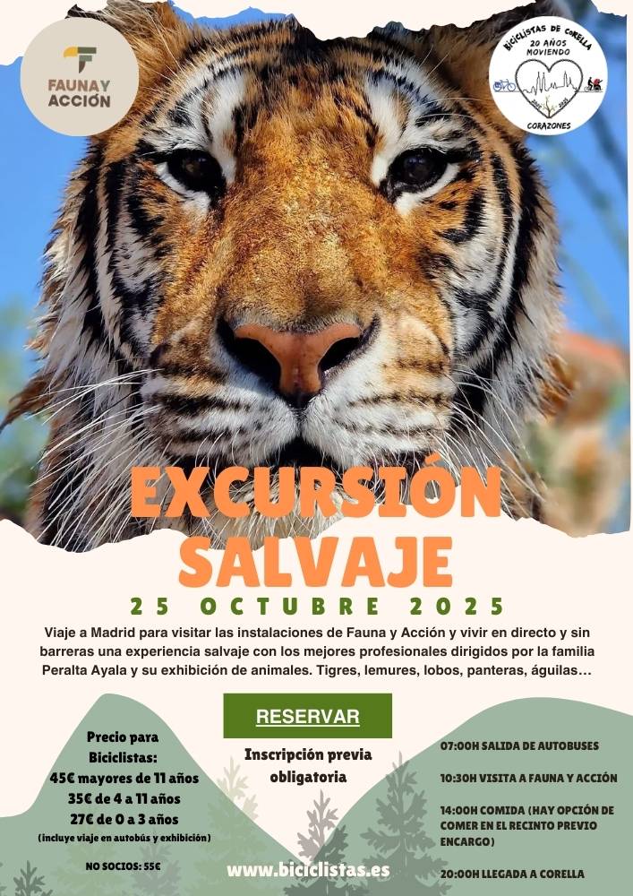 Con motivo del 20º aniversario de Biciclistas organizamos una excursión especial, visita a las instalaciones de Fauna y Acción en la Comunidad de Madrid. Podrás vivir en directo y sin pantallas una experiencia salvaje con los mejores profesionales dirigidos por la familia Peralta Ayala. Exhibición de animales salvajes: tigres, lemures, lobos, panteras, águilas, azores…